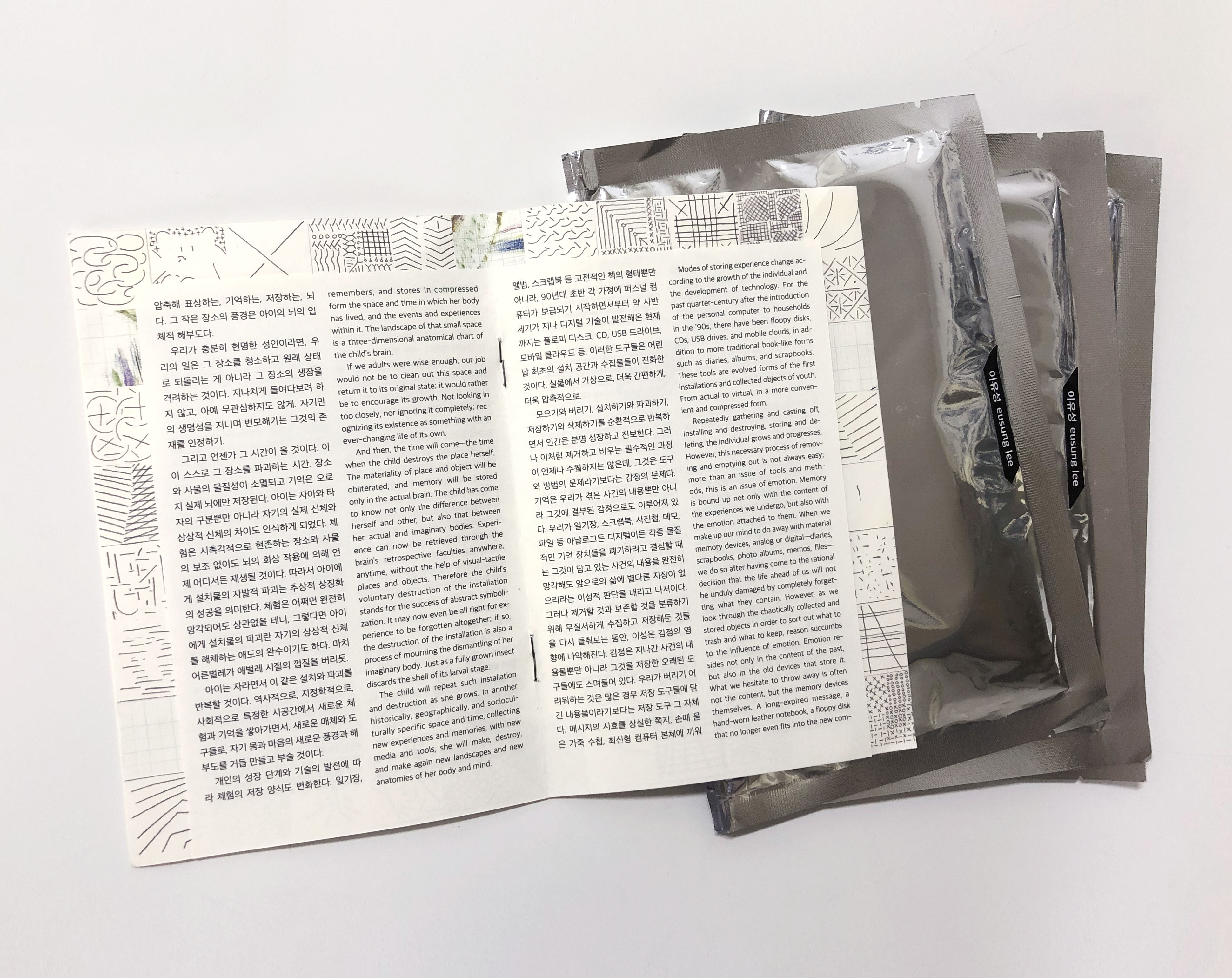 “기억장치에 저장된 데이터들"을 “2차원의 사물 몇 가지로 공간을 구성"하는 기획의 전시로, 파일이나 팝업창 등의 이미지를 이용하여 컴퓨터 모니터 화면을 종이 위로 옮긴 듯 디자인하였습니다. 리플렛의 봉투 역시 외장하드에 쓰이는 금속 재질을 느낄 수 있도록 은박 증착 봉투에 스티커를 붙이도록 만들었습니다.