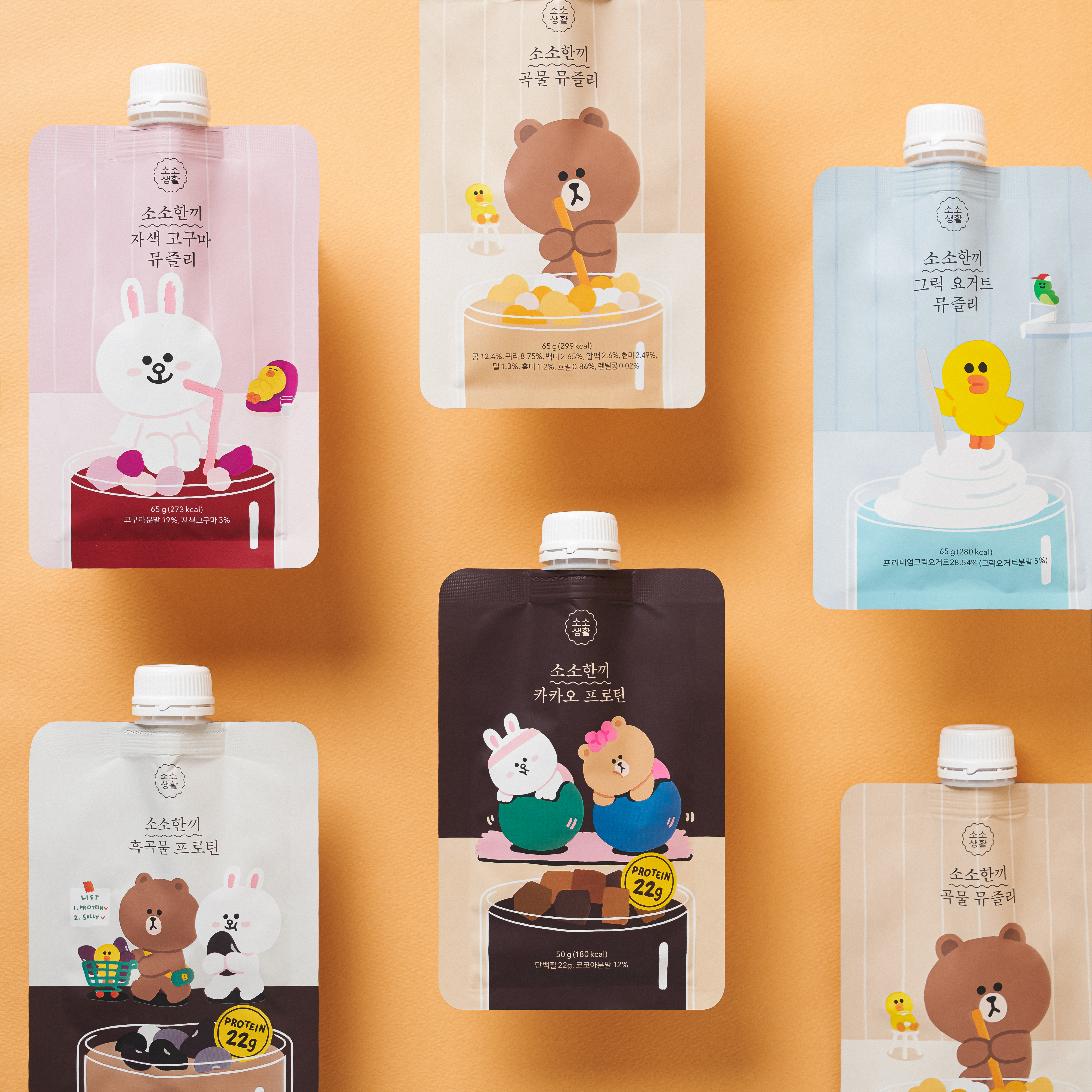 <라인프렌즈>의 캐릭터를 적용해 <소소생활>의 간편식 ’소소한끼’ 6종 패키지 디자인을 하였습니다. 기존의 차분하고 다운된 톤은 유지하되 캐릭터와 소소한끼가 연결될 수 있는 각각의 스토리텔링을 패키지 전반에 녹여내어 귀엽고 유쾌한 이미지를 담아냈습니다.